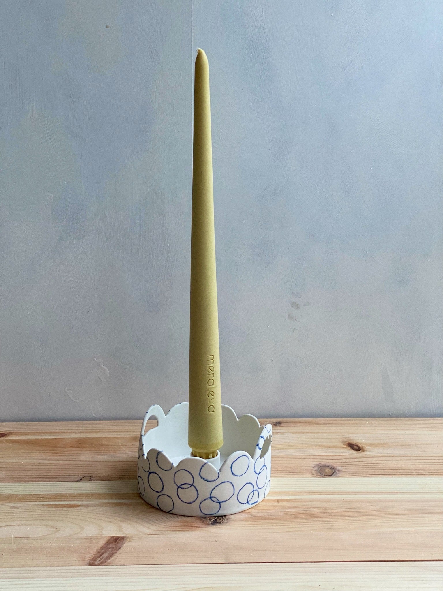 Ljusstake i vit porslinslera. Handritade cirklar.