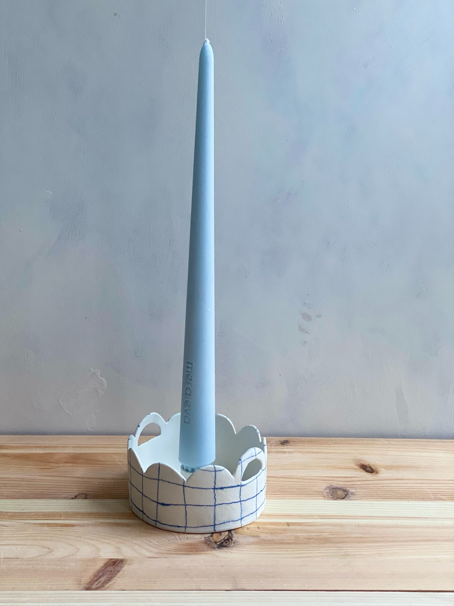 Ljusstake i vit porslinslera. Handritade streck.