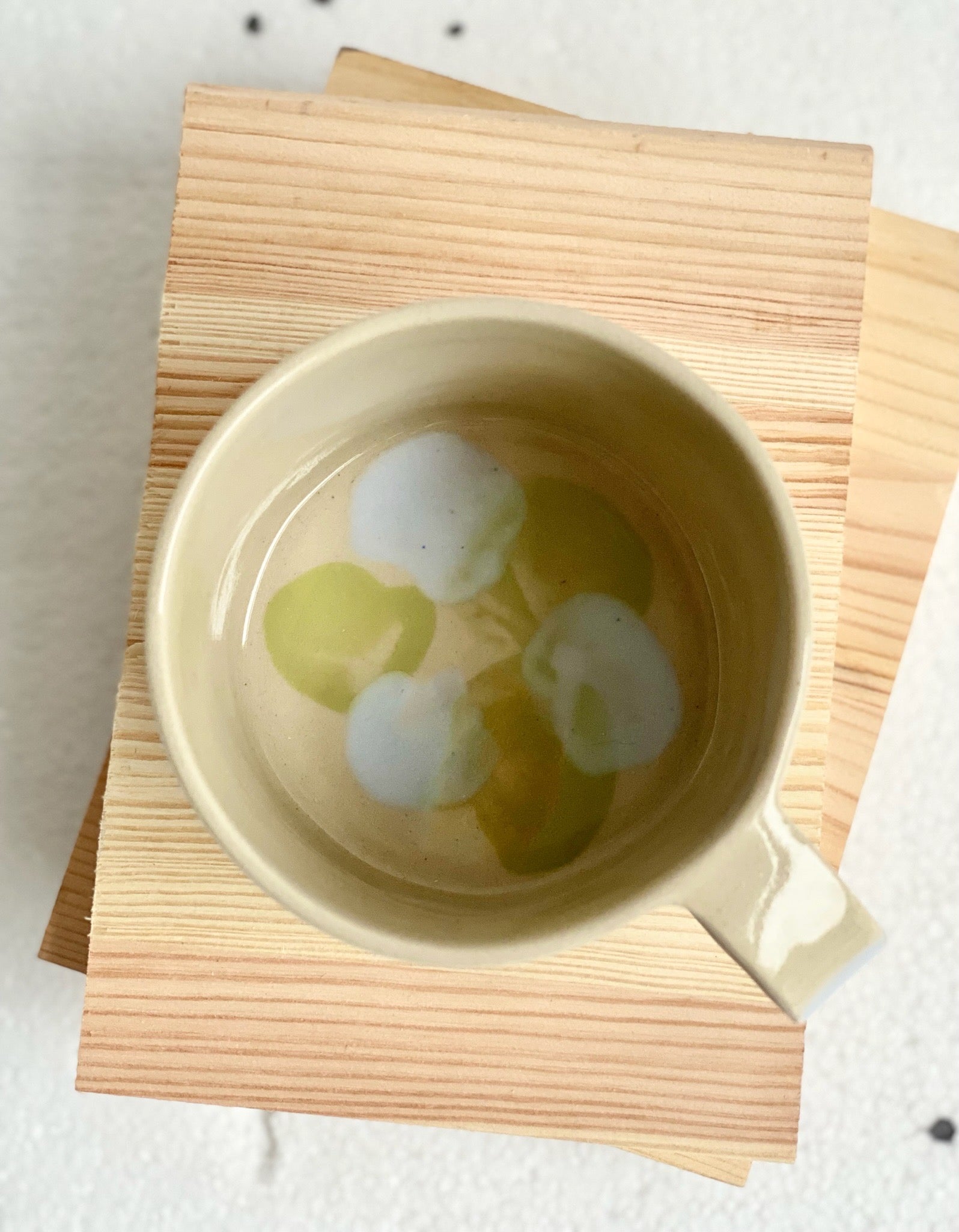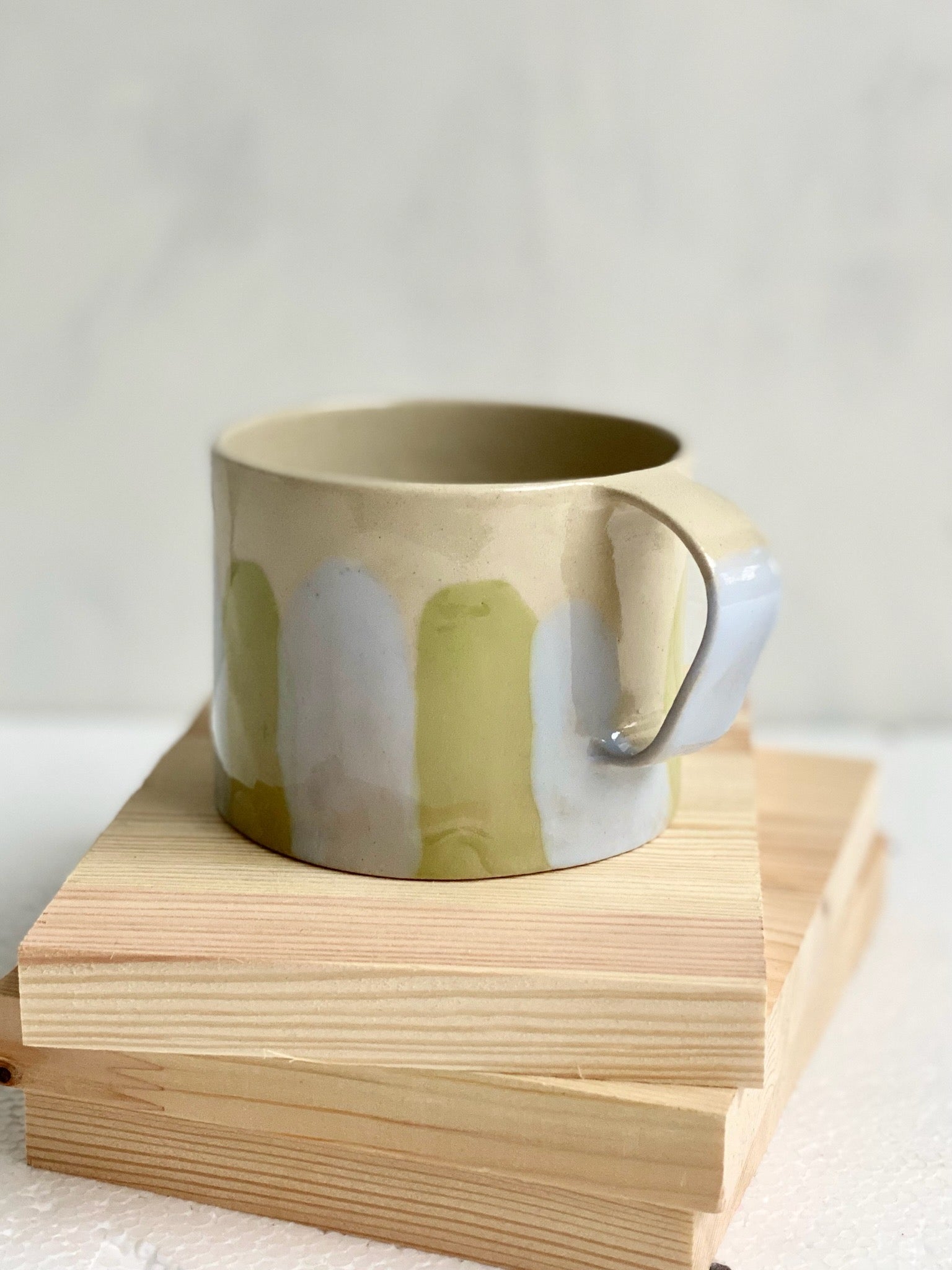 Tekopp i stendgodslera, randig olivgrön/pastellblå