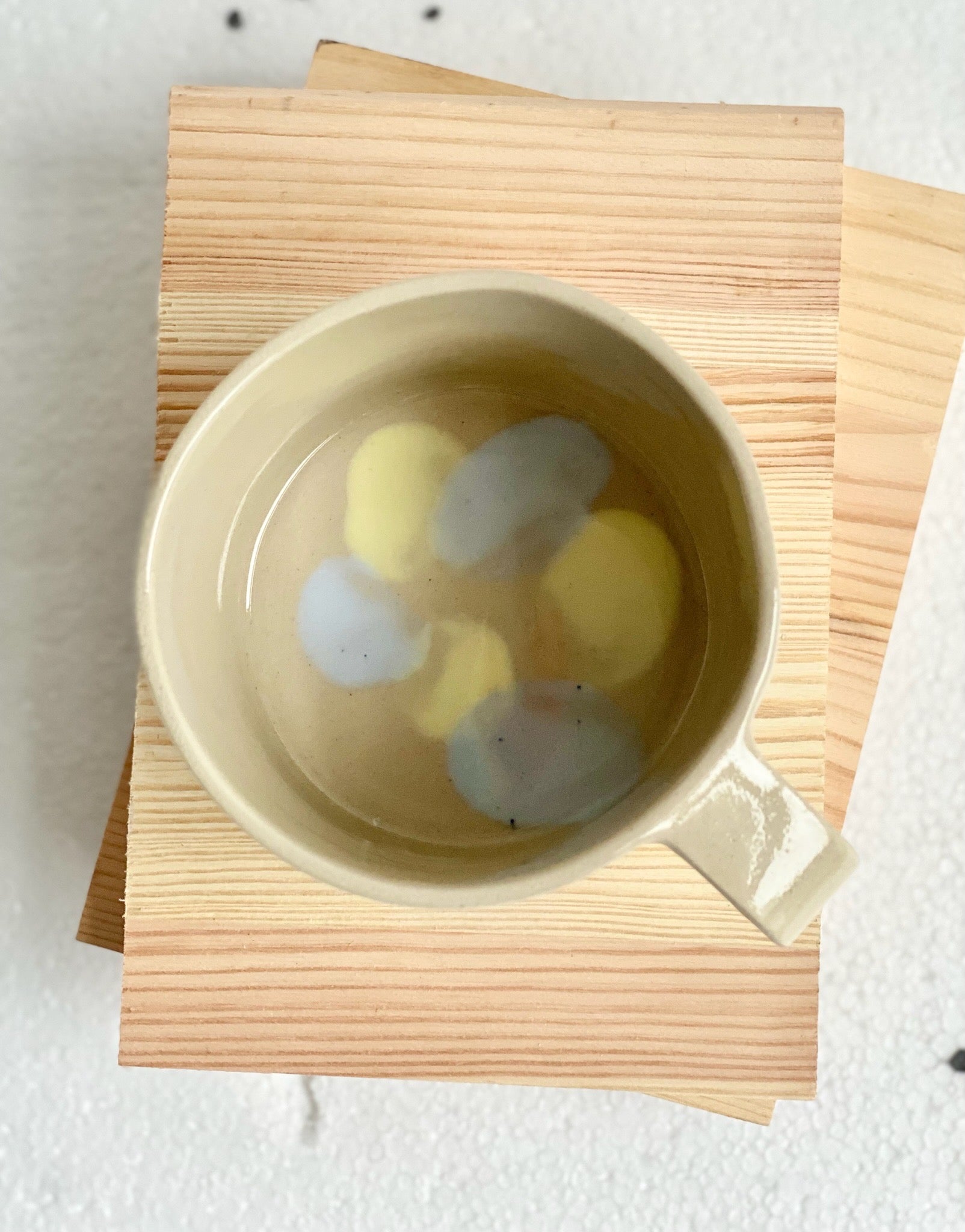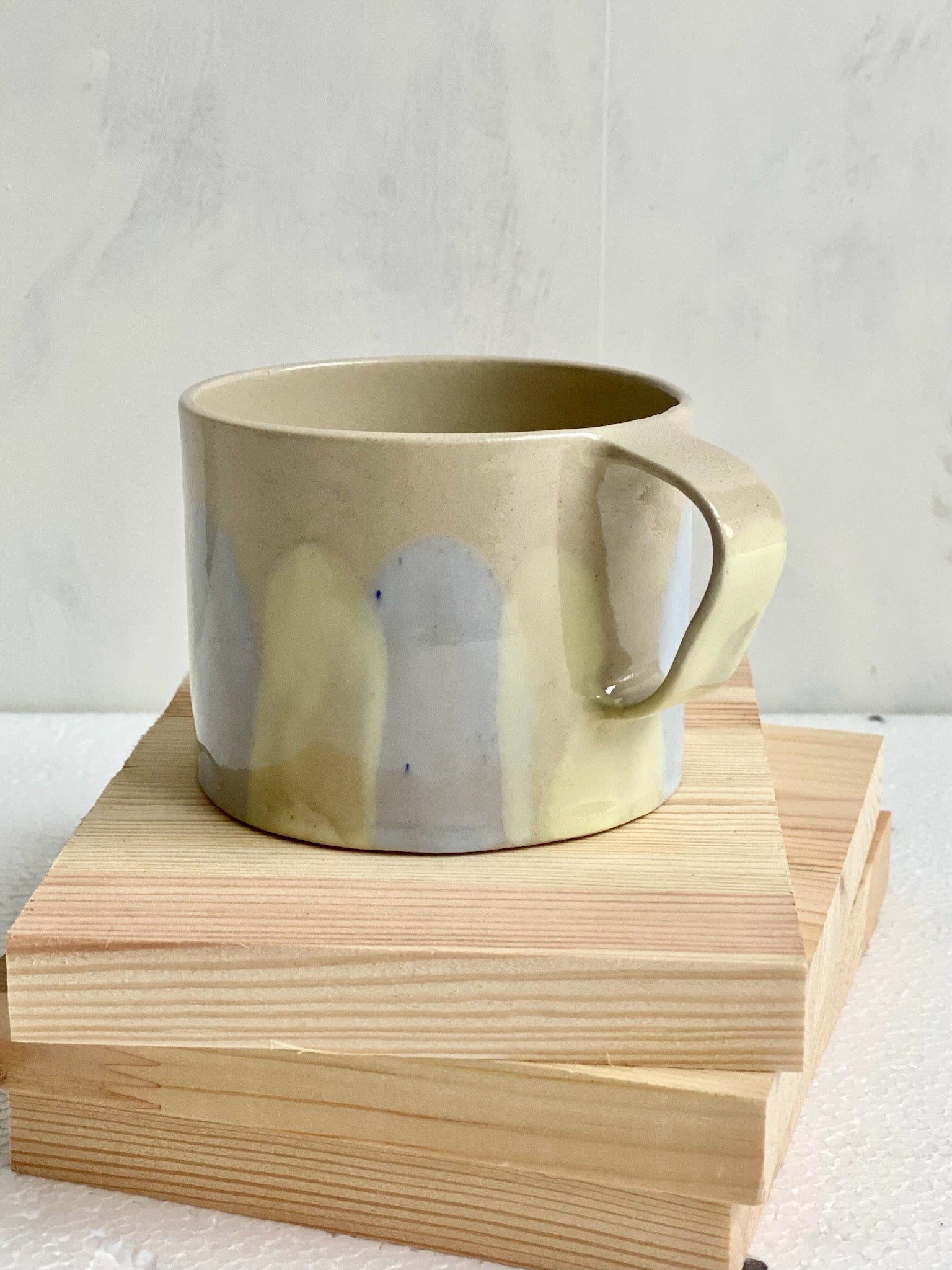 Tekopp i stengodslera, randig pastellblå/gul