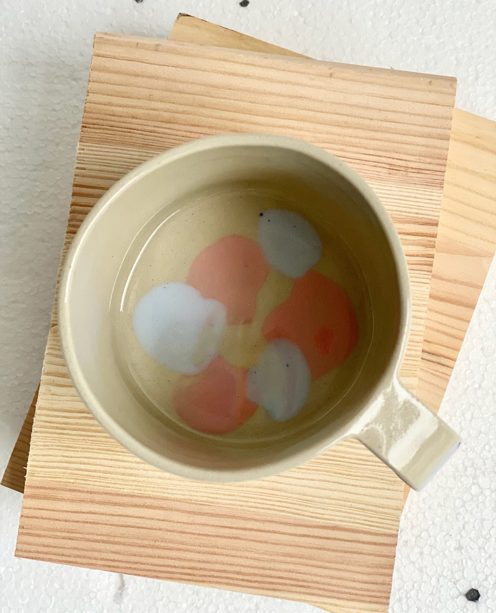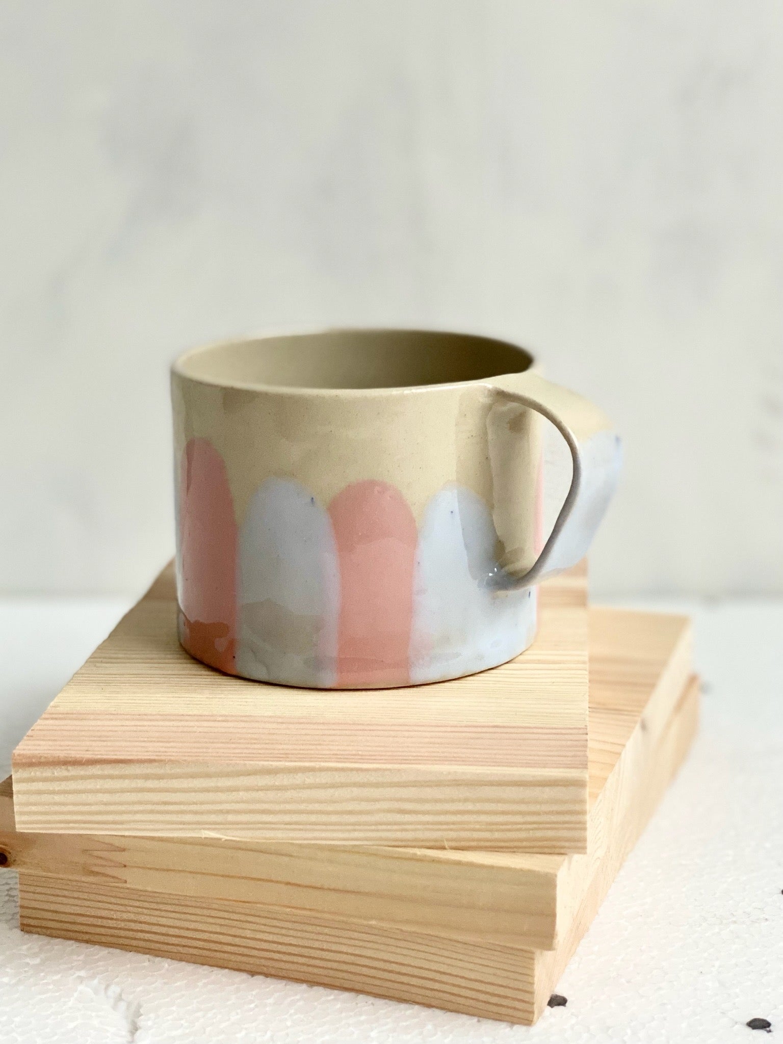 Tekopp i stengodslera, randig pastellblå/rosa