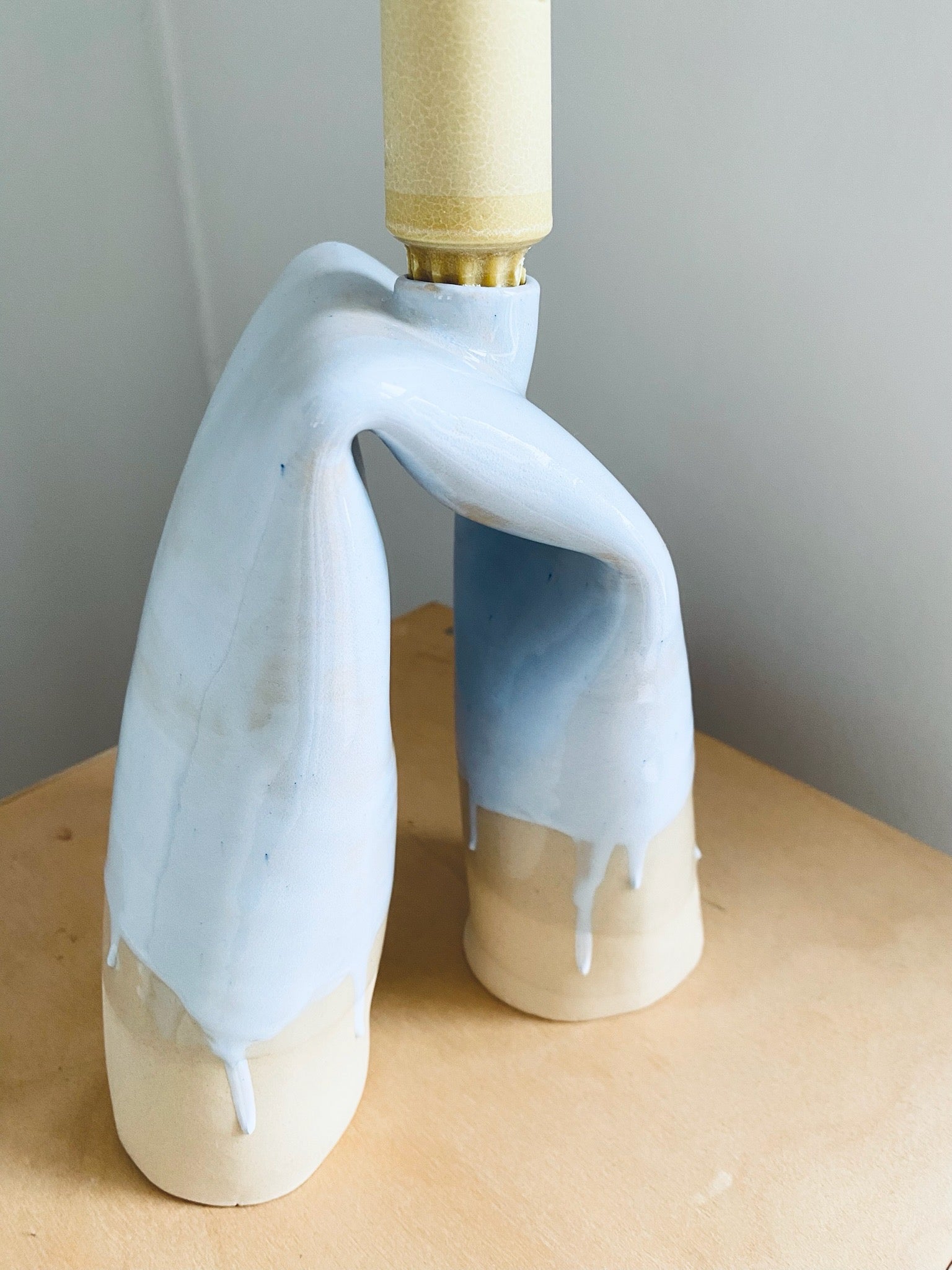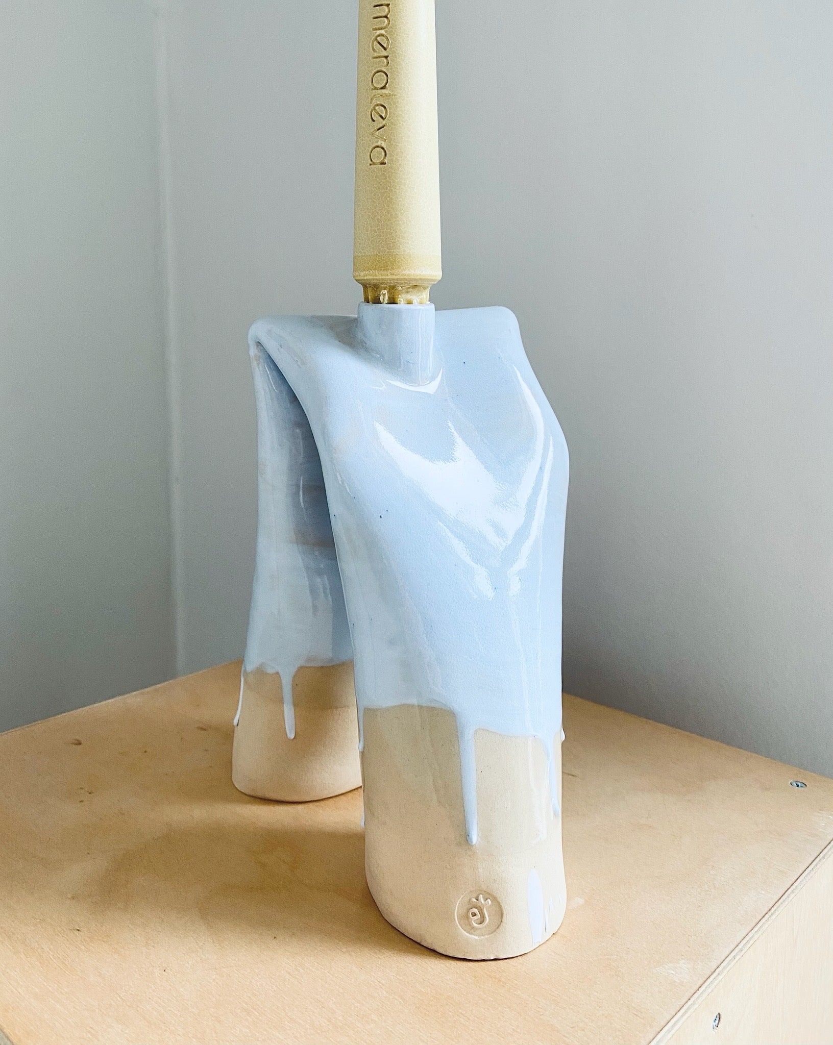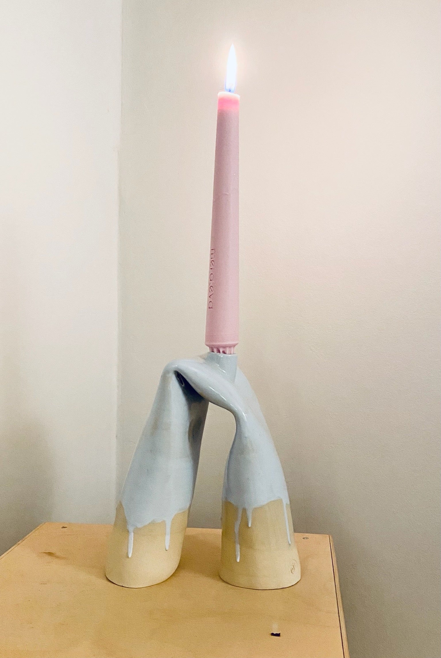 Pastellblå ljusstake i beigevit stengodslera