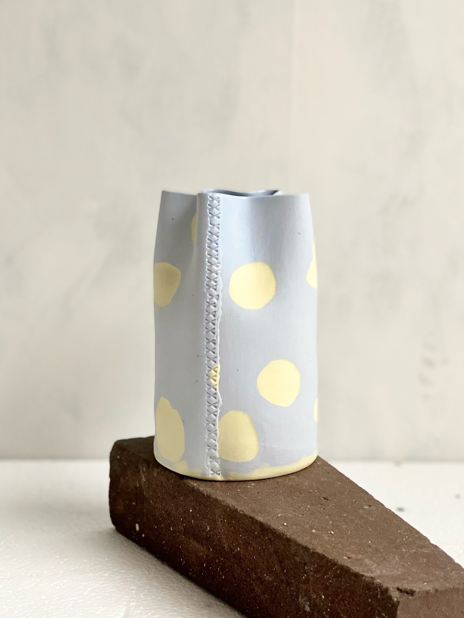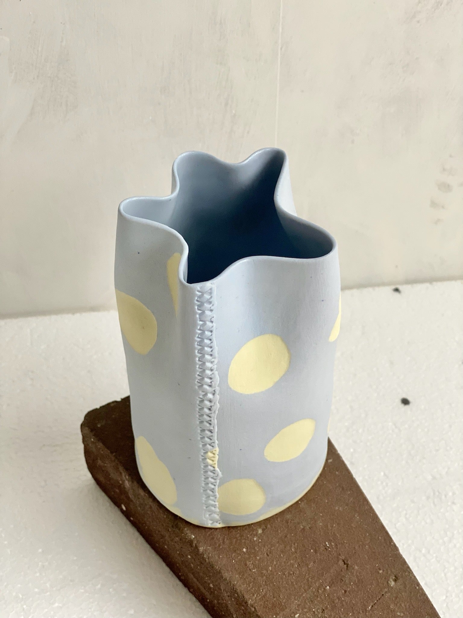 Pastellblå vas med gula och mörkblå prickar.