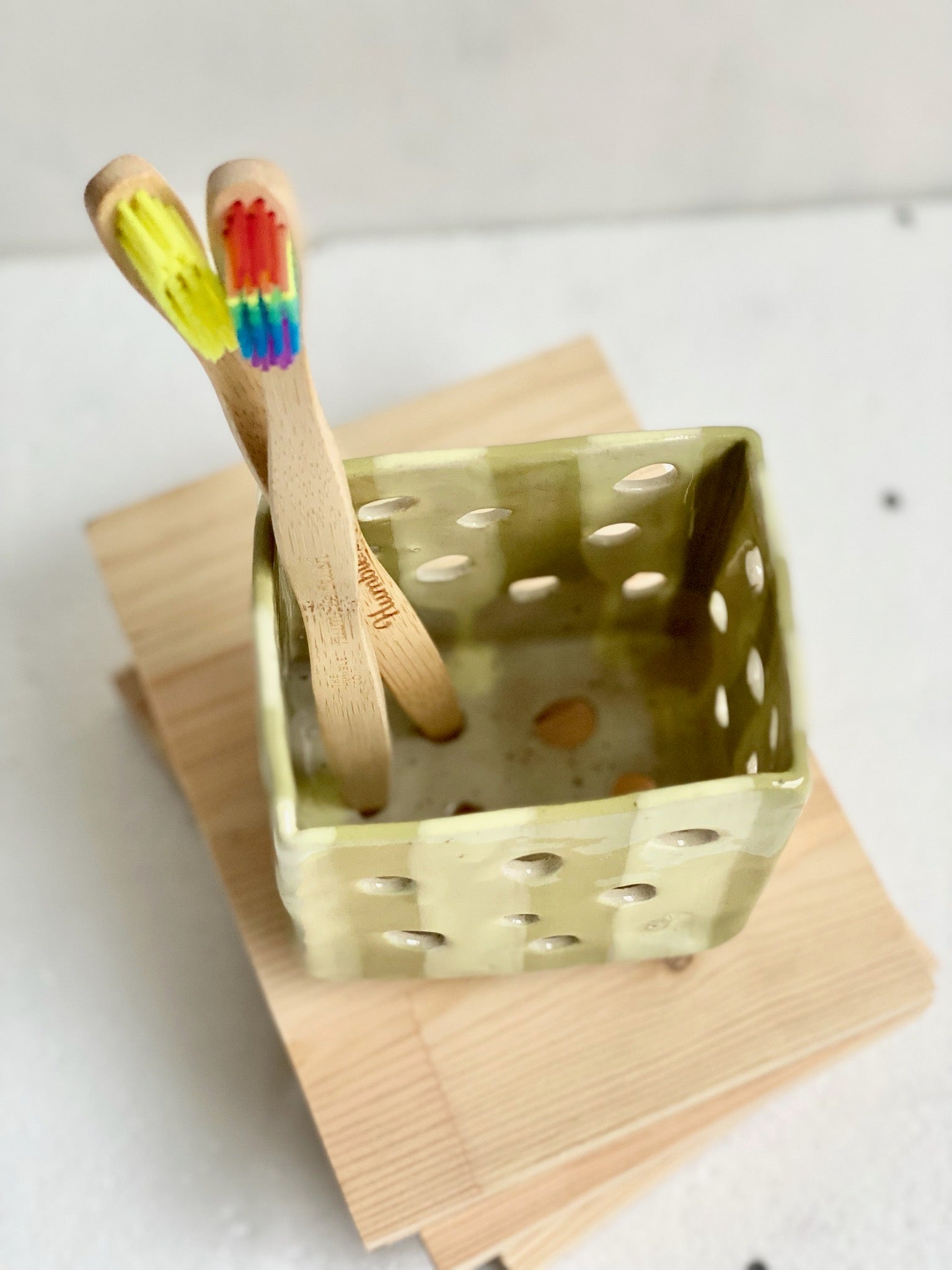 Rymmer både tandkrämstuben och ett gäng tandborstar.