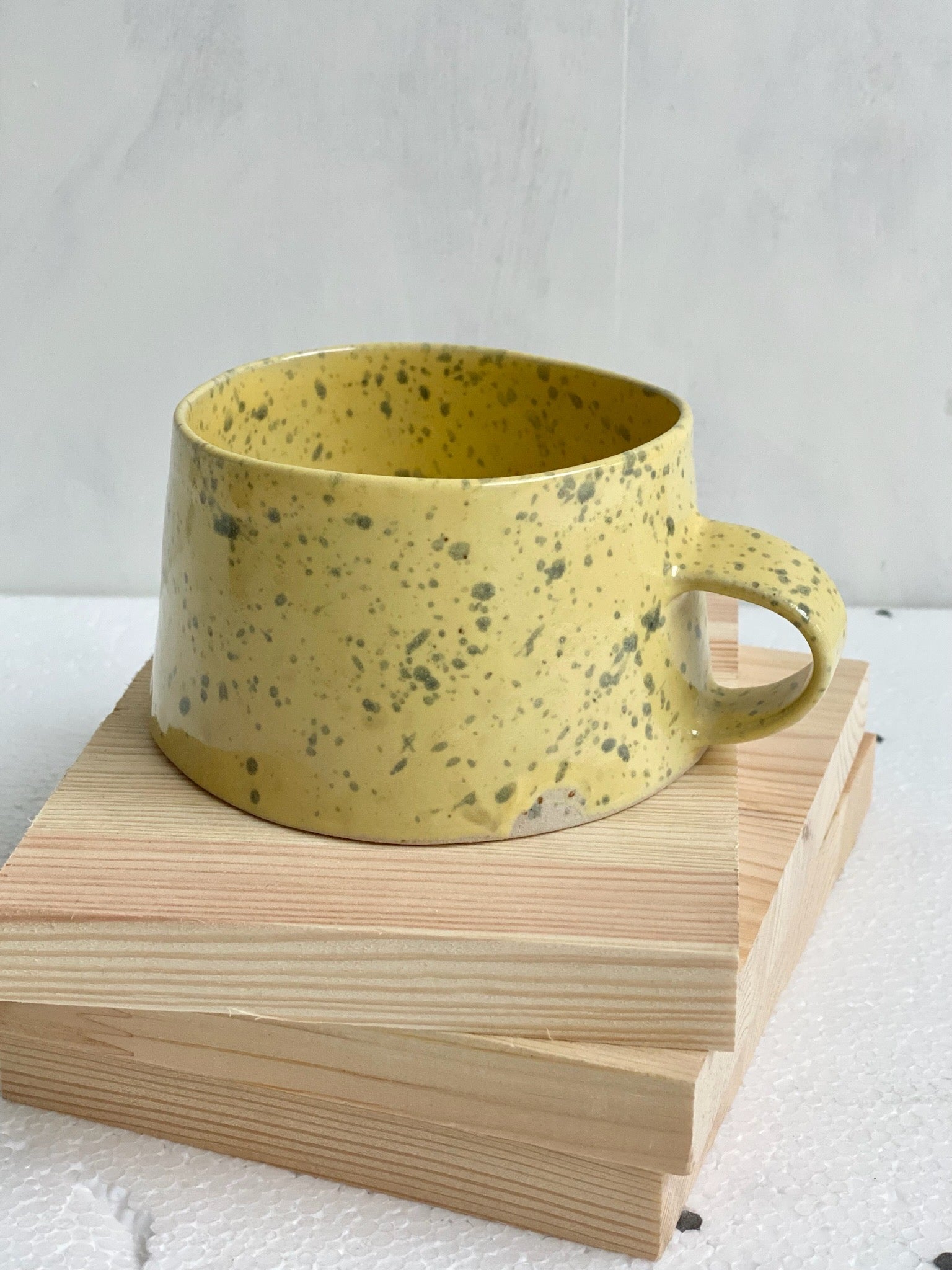 Tekopp i stengodslera. Gul med gråblå stänk.