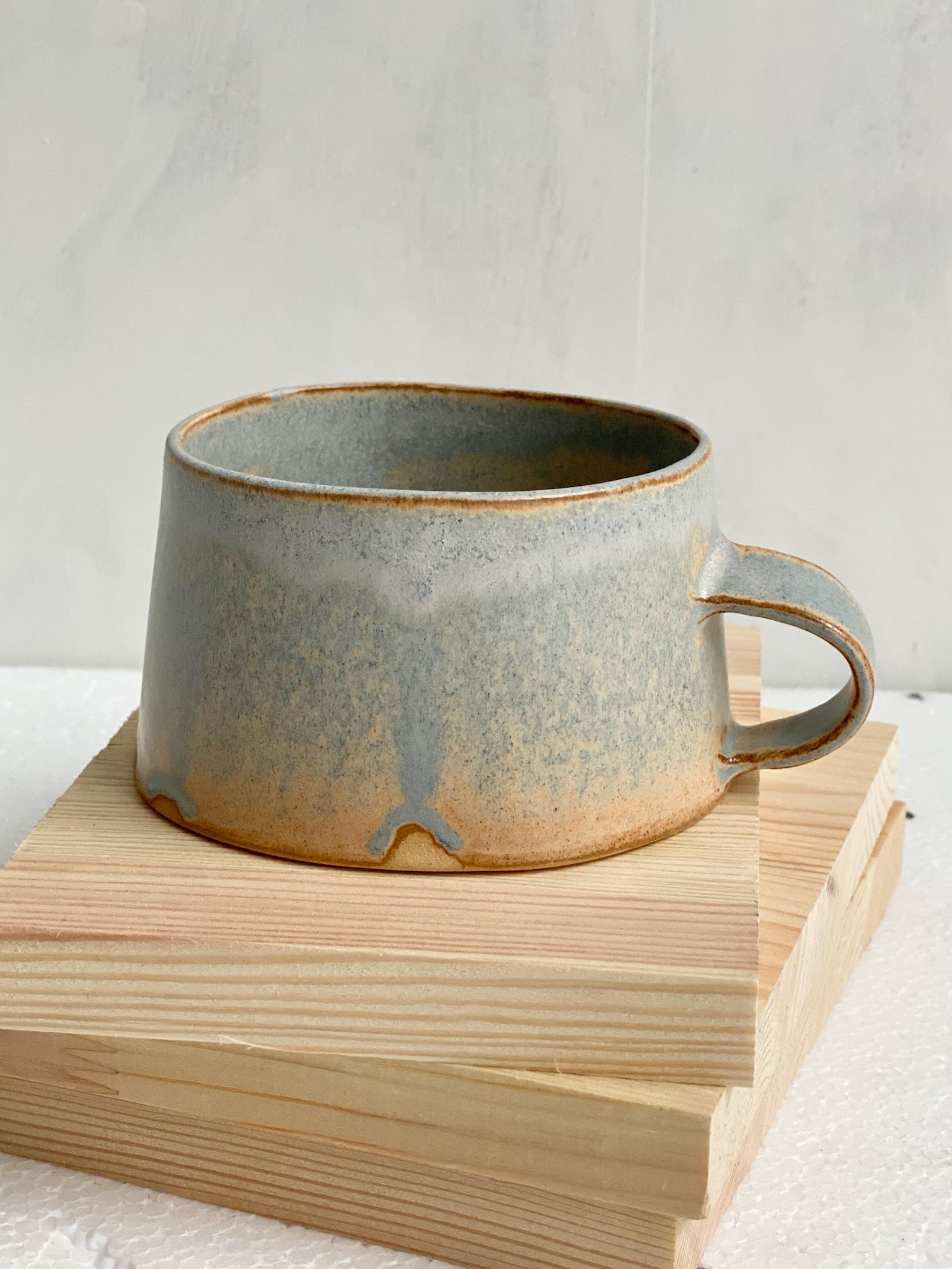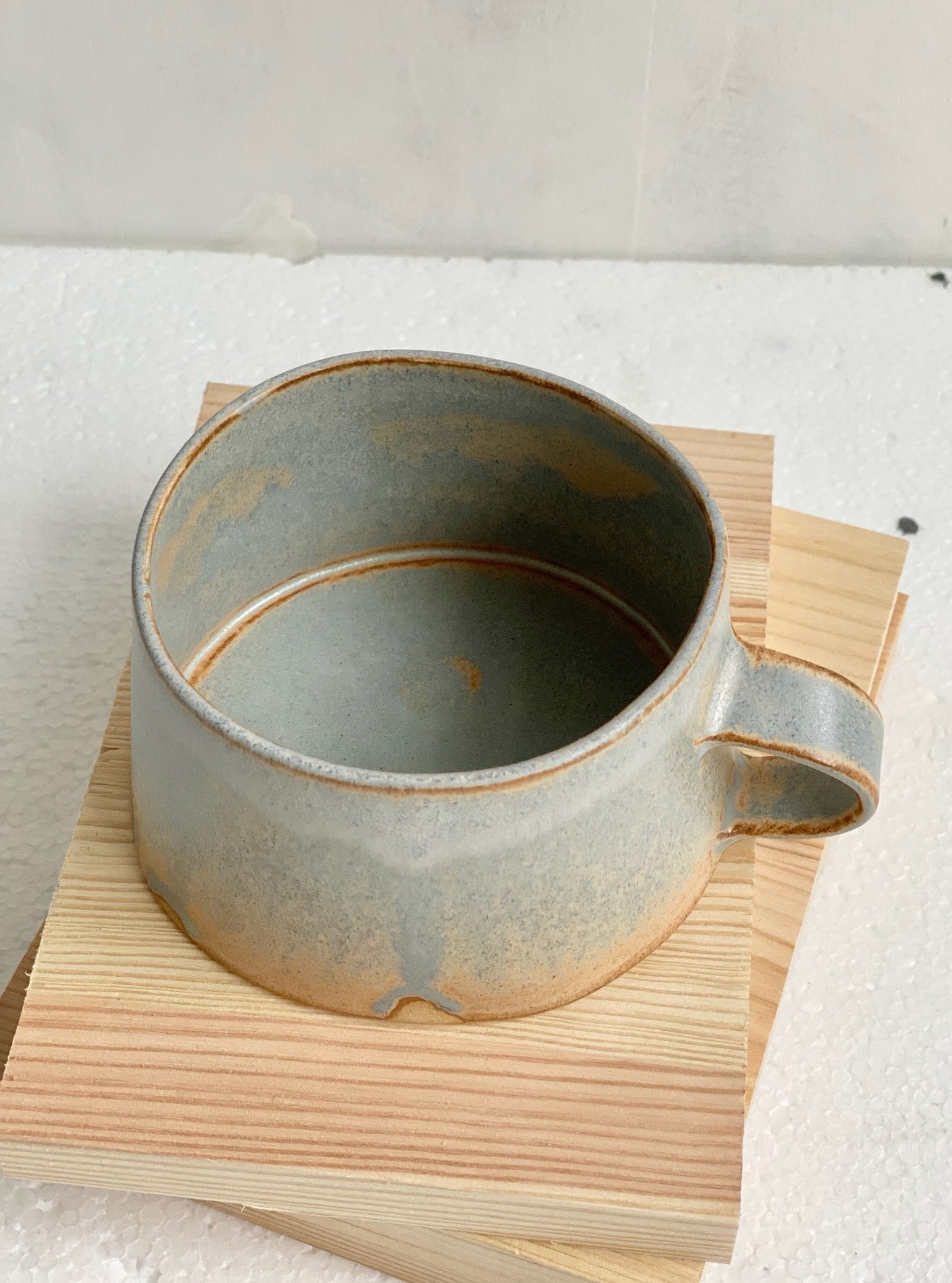 Tekopp i stengodslera, glaserad i matt blågrönt.